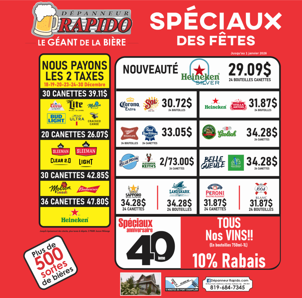 Depuis plus de 40 ans, le dépanneur Rapido est l’endroit incontournable pour l’achat de bière en Outaouais. Le «géant de la bière» offre, à ce jour, plus de 500 sortes de bières variés au meilleur prix sur le marché. Vous-y trouverez des bières de microbrasseries québécoises, de brasseries populaires et des bières importées. Découvrez nos sélections de bière en magasin ou en ligne !